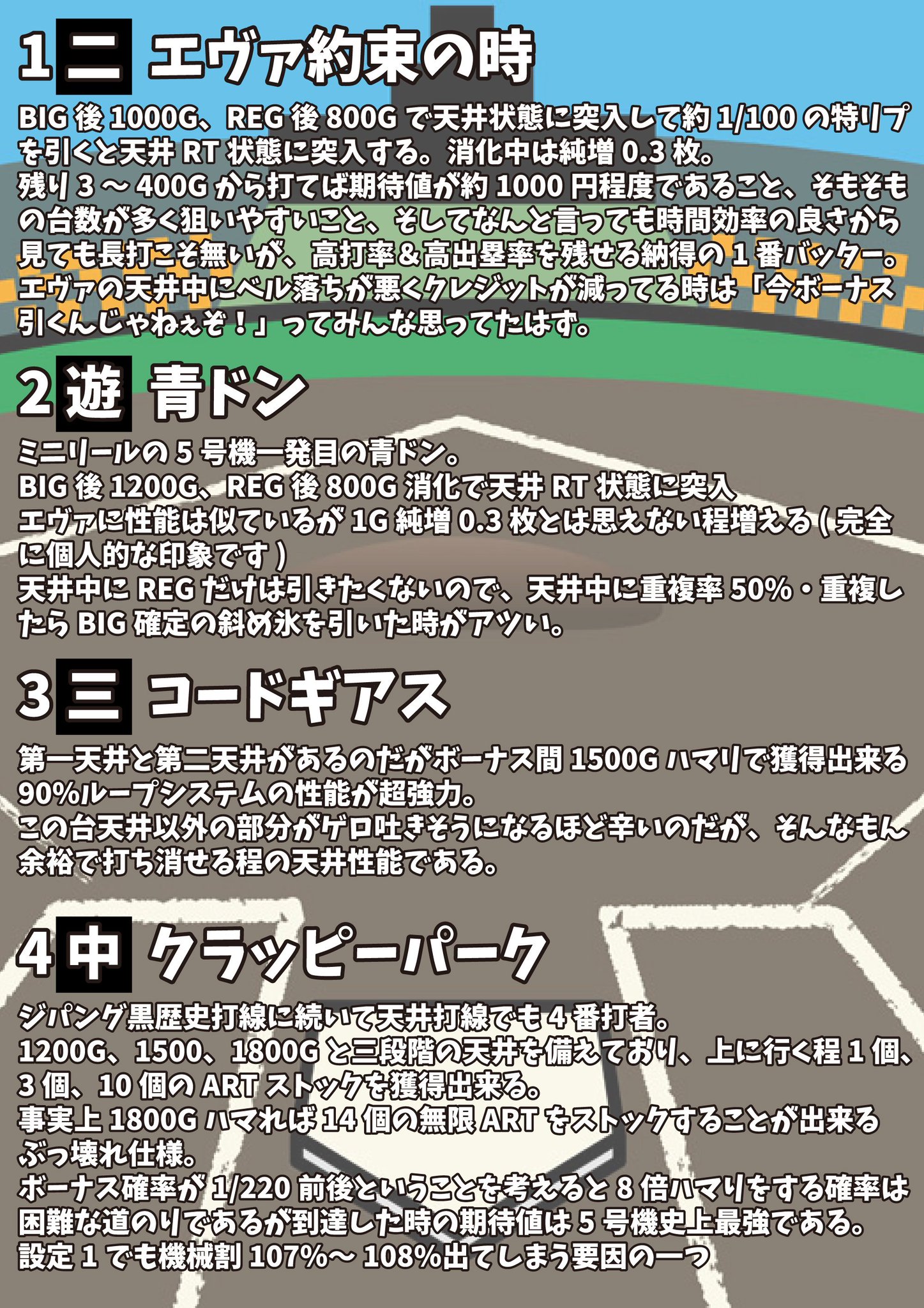中野ジパング 公式アカウント On Twitter 5号機打線の時間だぁー 今回はコメントで頂いた 5号機の天井 で打線作ってみました どれも強すぎて1 2番以外は全員強打者になってしまいました 笑 今回も今まで同様 現在ジパングに設置している機種は入れてない