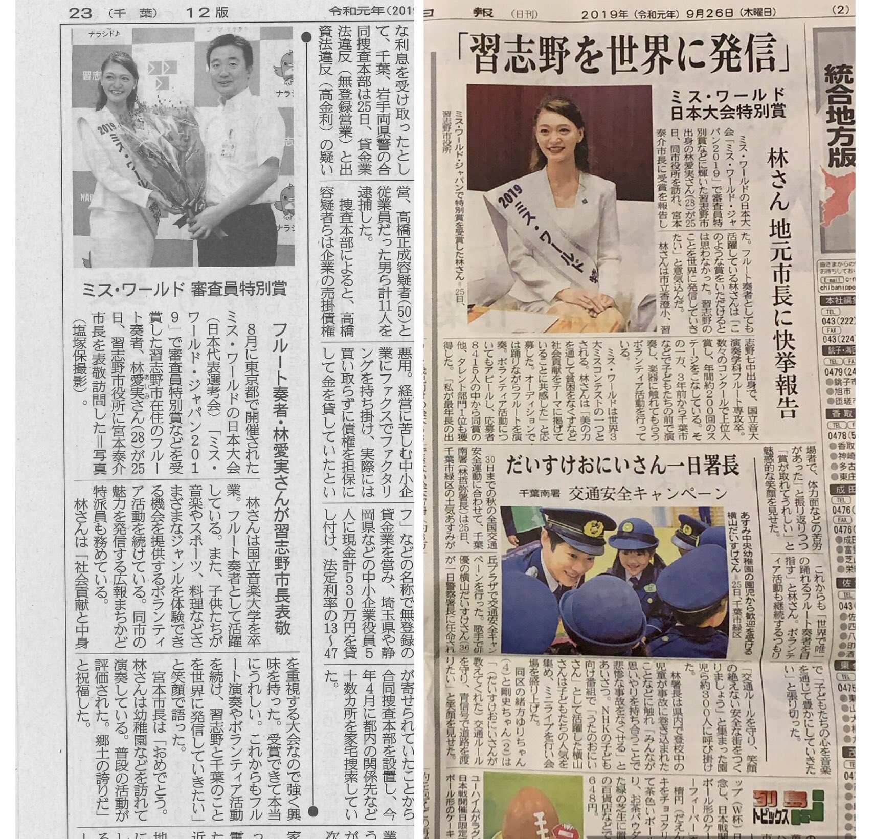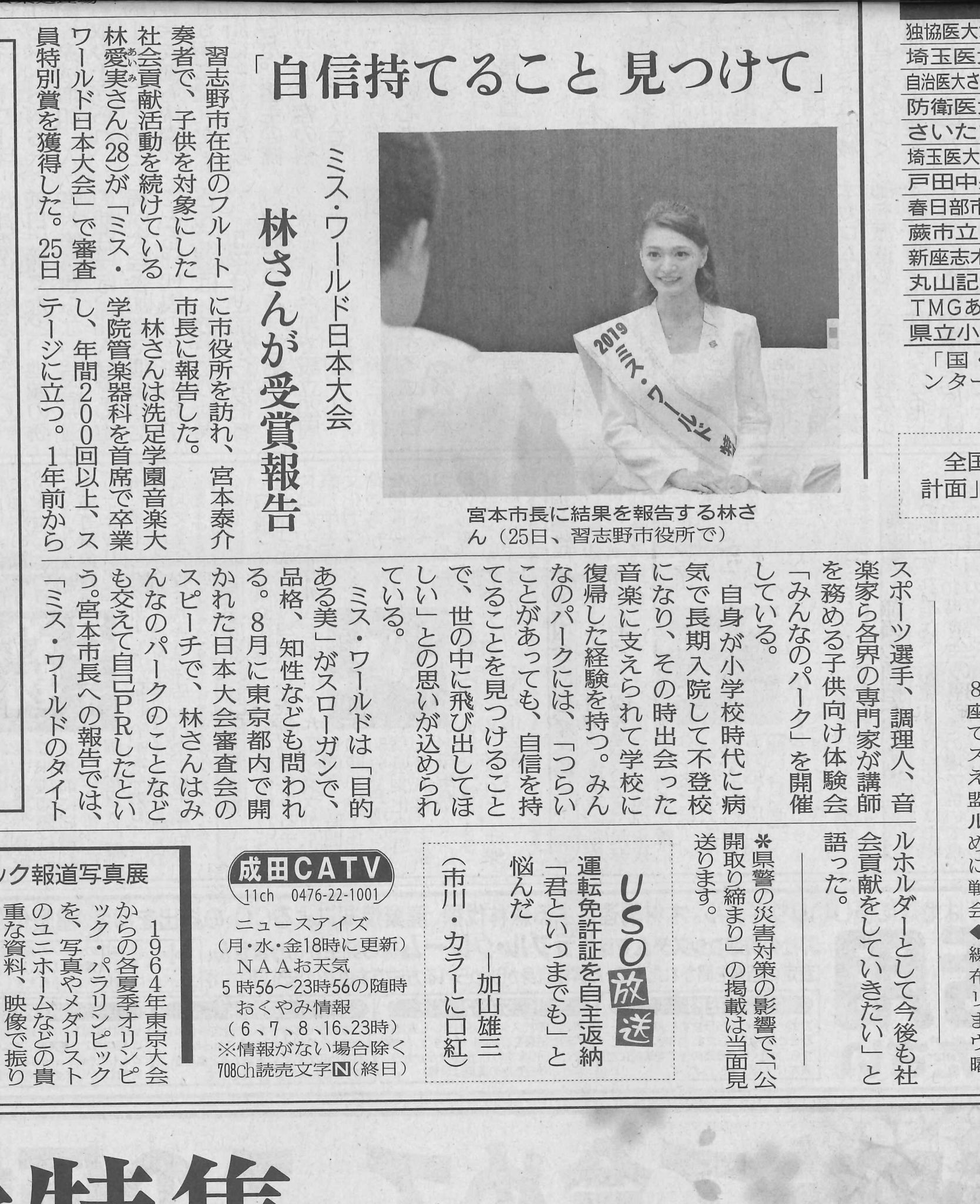 林愛実 フルート奏者 On Twitter 産経新聞 様 千葉日報 様 読売新聞 様 毎日新聞 様 の各紙に 昨日の表敬訪問の様子が掲載されました ご足労頂きました記者の皆様 宮本市長や市役所の皆様に心から感謝しております 習志野市 や 林愛実 みんなのパーク