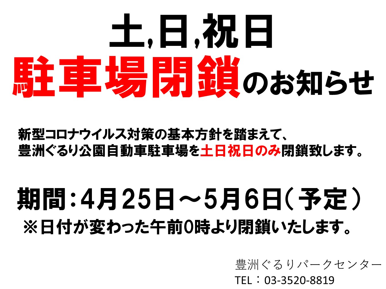 豊洲ぐるりパーク On Twitter 新型コロナウイルス対策の基本方針を踏まえて 豊洲ぐるり公園自動車駐車場を土日祝日のみ閉鎖致します 期間 4月25日 5月6日 予定 の土日祝日 日付が変わった午前0時より閉鎖致します ご迷惑をお掛けしますが 何卒ご理解の程